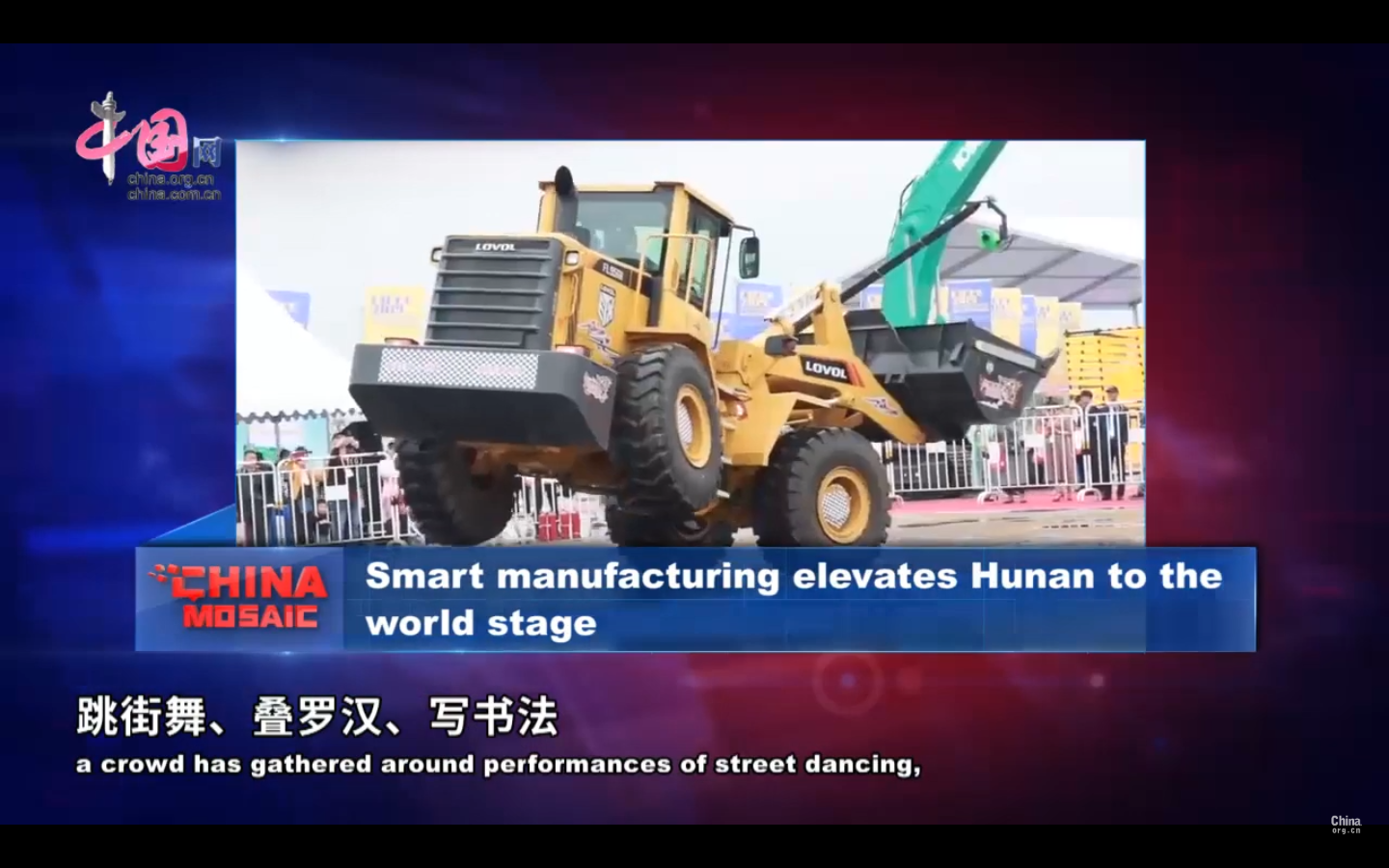 In a special outdoor arena in Hunan's capital city Changsha, a crowd has gathered around performances of street dancing, cup stacking, and Chinese calligraphy. Yet these familiar feats of skill are not acted by dexterous youths, but bulky, lumbering excavators and bulldozers.