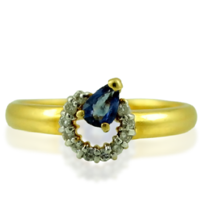 18k ladies ring with round brilliant cut diamonds and sapphire, yellow gold.