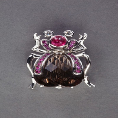 “18kwg brooch-pendant “”pink beetle”” with 1 smokey quartz 12.847 ct 2 diamonds 0.169 ct. 1 cabochon spinel 1.0 ct and 18 pink rubies 0.477 ct.”