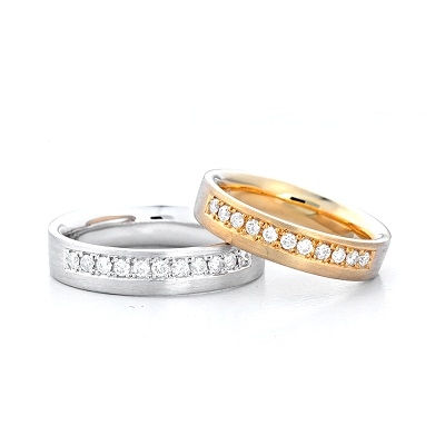 Female Ring: 18K gold matte wedding band with 11 diamonds. Total carat weight 0.22ct diamonds