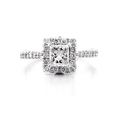 14K white gold featuring a princess cut center stone with diamond halo and petit pave band. Total carat weight 1.1ct diamonds