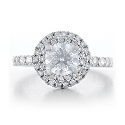 18K white gold, featuring a round brilliant cut. Set with with double halo and petite pave band.