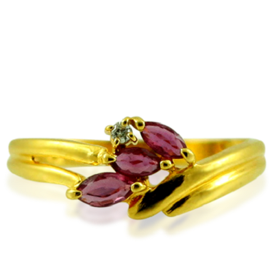 18k ladies ring with round brilliant cut diamonds and ruby, yellow gold.