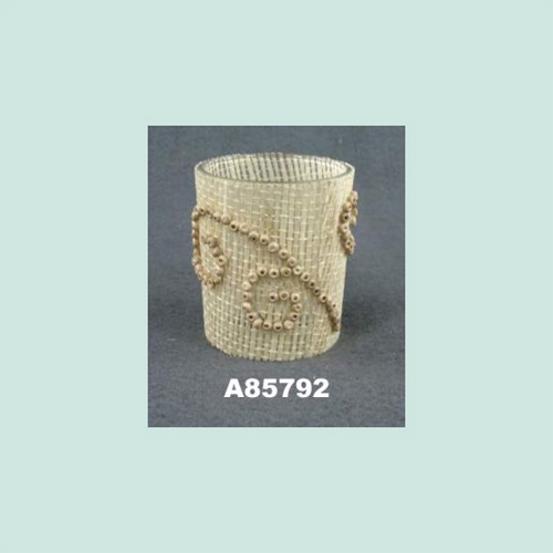 Glass votive wrapped with baclad, with swirl beads accents.  For tealight candles