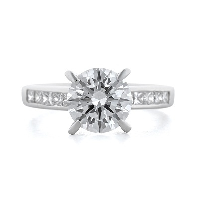 Solitaire in channel band setting, featuring a round brilliant diamond center stone.