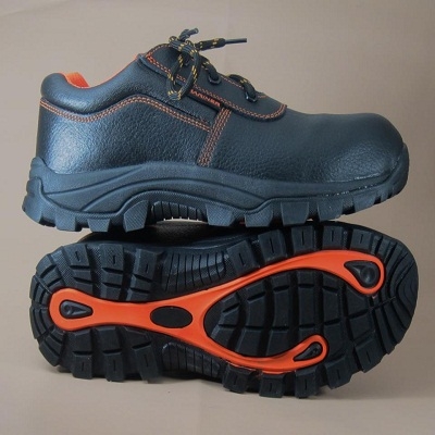 Heavy duty non-metal, lightweight, water resistant safety shoes, water resistant black upper leather with orange stitching, black/orange round laces, eva rubber sole, polyurethane sole, 200 joules composite toe cap, electrical resistant, oil and chemical resistant, S-2 quality, certified by Occupational Safety and Health Center under class 75 (Heavy Duty), with composite mid sole.